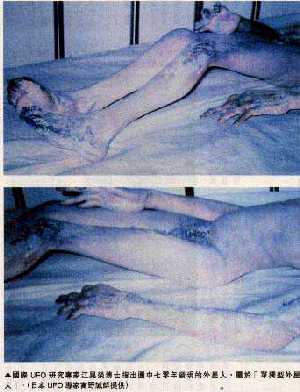 ![]() ![]() Curious photos depicting a purported alien were posted to the internet back in August 95. They were said to have originated in a weekly Chinese tabloid called the MING PAO Weekly. The claim was that they were photos of the real Roswell aliens.